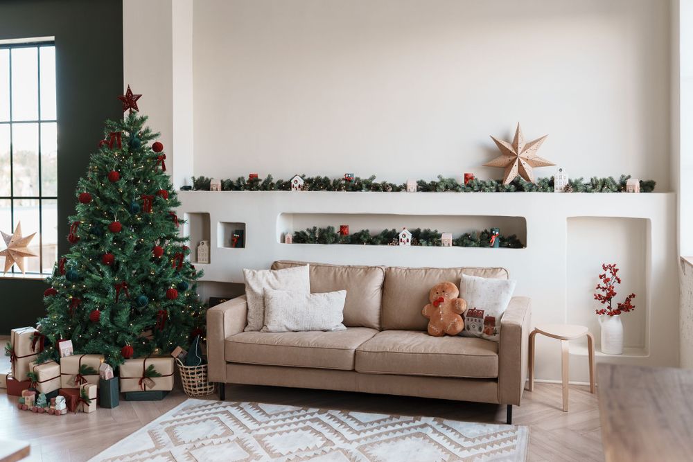 🎅🏻🌲 Lost: klasszikus karácsonyi hangulatot áraszt, mélyzöld és bordó színekben pompázó díszítéssel, gazdagon feldíszített karácsonyfával és meleg fényű égősorokkal. A foteles rész falszakaszát mélyzöldre festettük, ami igazán különleges karaktert ad a teremnek.